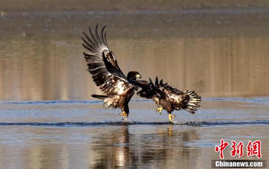 11月30日,一对金雕在新疆焉耆县境内的开都河栖息,似乎在河面抓捕小鱼,目光锐利。(确·胡热摄)