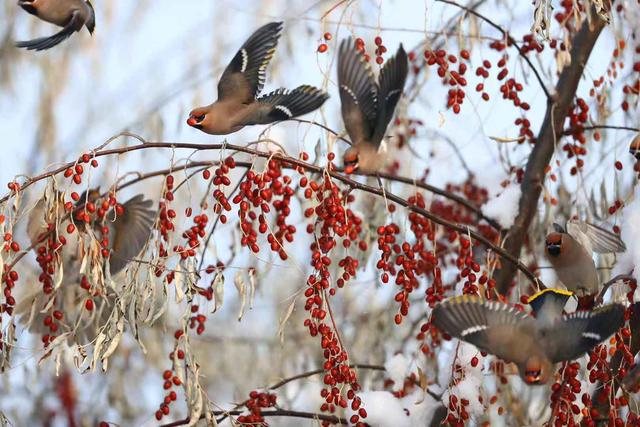 太平鸟组团来疆越冬 吸引不少游人驻足拍照