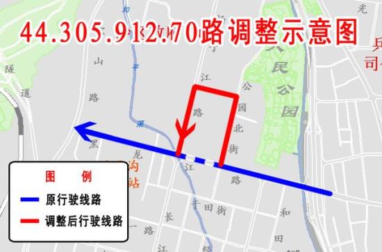44、305、912、70路调整示意图。 44路(大湾至火车南站方向)取消黑龙江路部分路段,绕行公园北街、文化宫路、扬子江路后驶回原线运营。 305路(百商百乐苑至双赢国际方向)取消黑龙江路部分路段,绕行公园北街、文化宫路、扬子江路后驶回原线运营。 912路(红二电至广汇北园春江南嘉苑方向)取消黑龙江路部分路段,绕行公园北街、文化宫路、扬子江路后驶回原线运营。 70路(六大市场至西山塑料厂方向)取消黑龙江路部分路段,绕行公园北街、文化宫路、扬子江路后驶回原线运营。