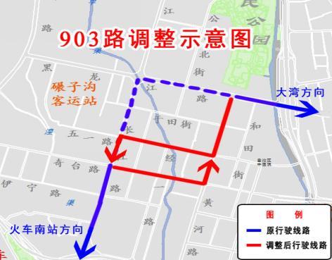 903路公交线路调整图。 903路 1.大湾至火车南站方向:取消黑龙江路部分路段,绕行黄河路、五一路后驶回原线运营。取消西公园、碾子沟2对双向站点,停靠调整后的现有站点。 2.火车南站至大湾方向:取消长江路、黑龙江路部分路段,绕行奇台路、黄河路后驶回原线运营。取消机电大厦1对双向站点,停靠调整后的现有站点。