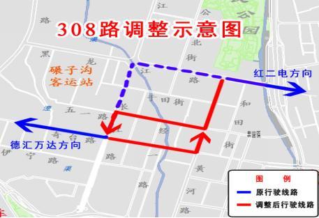 308路调整示意图。 308路 1.红二电至德汇万达方向:取消黑龙江路部分路段,绕行黄河路、五一路后驶回原线运营。取消西公园、碾子沟2对双向站点,停靠调整后的现有站点。 2.德汇万达往红二电方向:取消长江路、黑龙江路部分路段,绕行奇台路、黄河路后驶回原线运营。取消机电大厦1对双向站点,停靠调整后的现有站点。