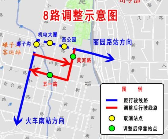8路调整示意图。 8路 1.丽园路至火车南站方向:取消黑龙江路部分路段,绕行黄河路、五一路后驶回原线运营。取消西公园、碾子沟2对双向站点,停靠调整后的现有站点。 2.火车南站至丽园路方向:取消长江路、黑龙江路部分路段,绕行于田街、黄河路后驶回原线运营。取消机电大厦1对双向站点,停靠调整后的现有站点。 (责任编辑:admin) |