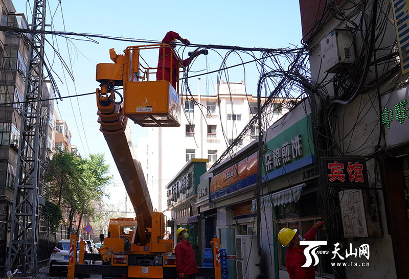 天山网讯(记者张冬梅 王琦铭摄影报道)5月26日,在乌鲁木齐市天山区小西门百姓市场,线缆切割员马青山站在黄色登高车上一一清理蜘蛛网状的各种架空线缆。与此同时,在红旗路西巷,工作人员也正在对这里拉接的各种线缆进行清理。 在乌鲁木齐市部分城市道路两侧和老旧居民小区,存在线缆乱拉乱挂现象,各类线网纵横交织,就像一张张“蜘蛛网”,既影响城市环境,又影响市民生活安全。 自乌市开展线缆“蜘蛛网”专项整治工作以来,全市已完成78条道路的“蜘蛛网”整治工作,另有77条道路已开始组织施工。第一期整治工作计划在6月底前全部完工,第二期3510条道路力争年内全部完成,提升城市“颜值”和“安全值”。